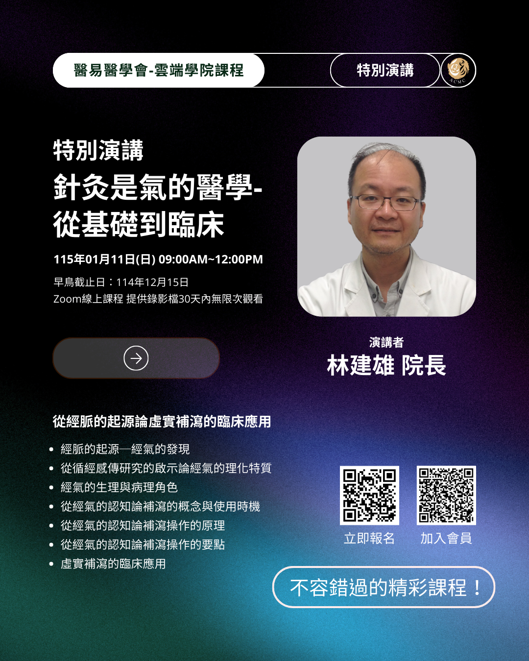 醫易醫學會雲端學院課程115年特別演講《針灸是氣的醫學-從基礎到臨床》免費報名開放中