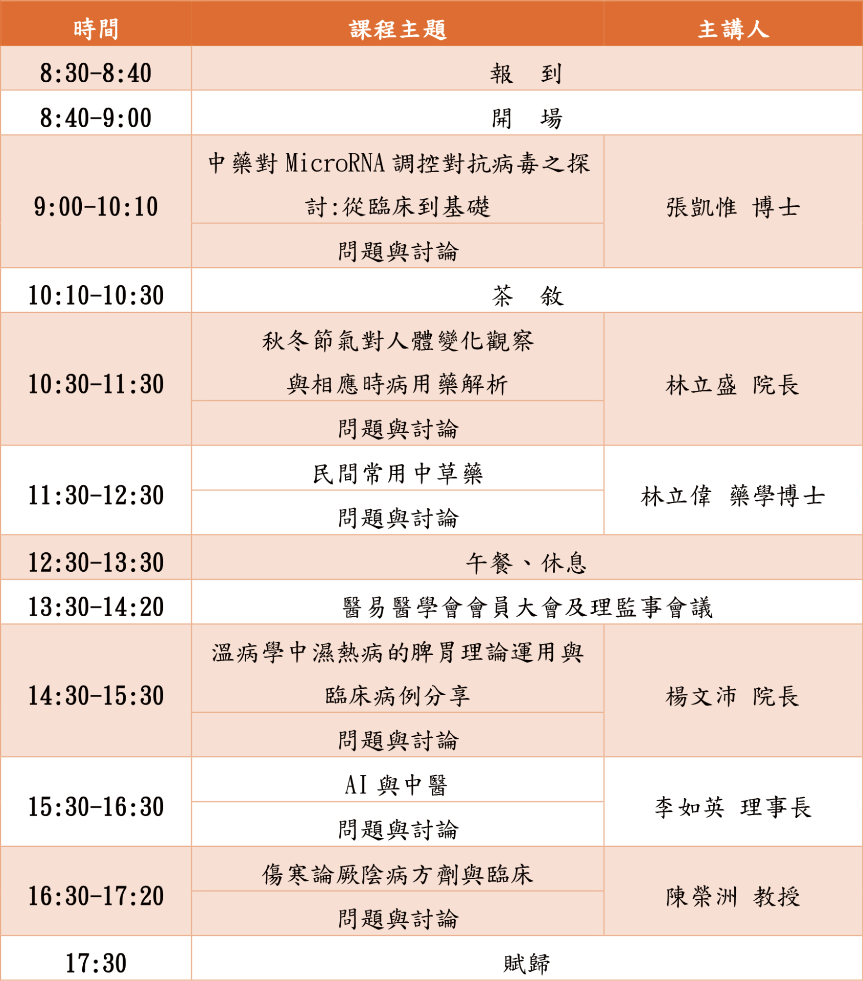 下午場第一堂課將以經典醫籍為基礎,結合歷代溫病醫家之論述,系統性說明濕熱病之脾胃病機、辨證要點與用藥思路;第二堂課介紹中醫與AI的結合應用,說明目前實際運用情形,並展望未來人工智慧深入中醫臨床、教學與研究之發展方向;第三堂課以《傷寒論》厥陰病為核心,說明其病機特點與臨床辨證思路,深入解析寒熱錯雜、厥陰寒化、厥陰熱化、厥陰瘀血及陰陽毒等常見證型,並結合經典方劑說明實際臨床運用。課程同時探討厥陰病與四類疾病之關聯,強化學員整體辨證與用方能力。